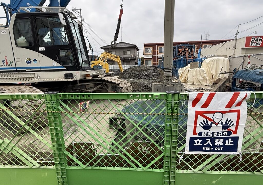 1月13日に様子を見に行った時にはまだ工事が行われていませんでしたが、2月11日に様子を見に行った時には足場が設置され敷地と歩道の境界部分にバリケードが設置されていました。