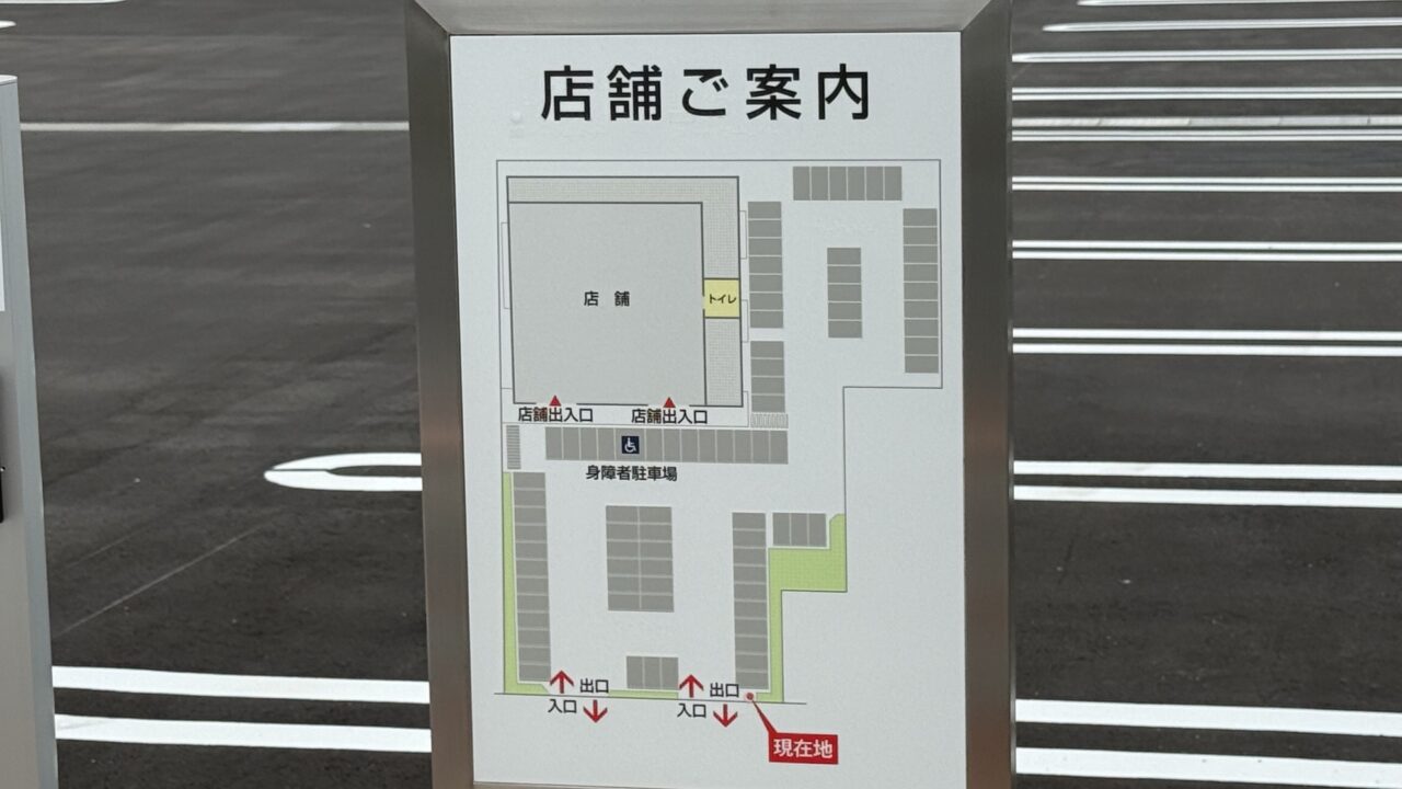 歩道付近に「店舗ご案内」と記載された看板が設置されており、敷地内での建物の位置や駐車スペースの配置などが分かりやすくなっていました。