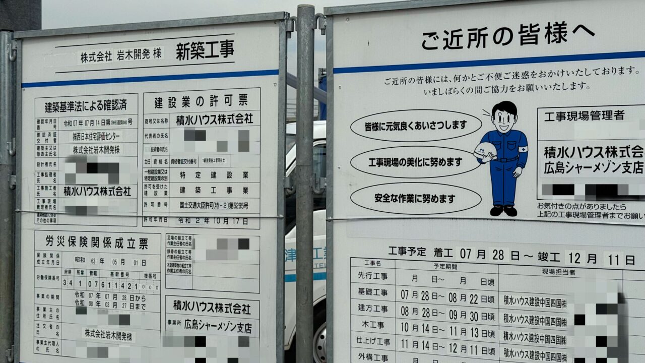 工事現場付近に設置された看板には「株式会社 岩木開発 様 新築工事」と記載されていました。