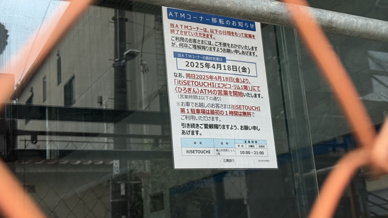 福山駅前で広島銀行のATMを利用しようとお考えの方は、「itiSETOUCHI」に移転したのでそちらをご利用ください。