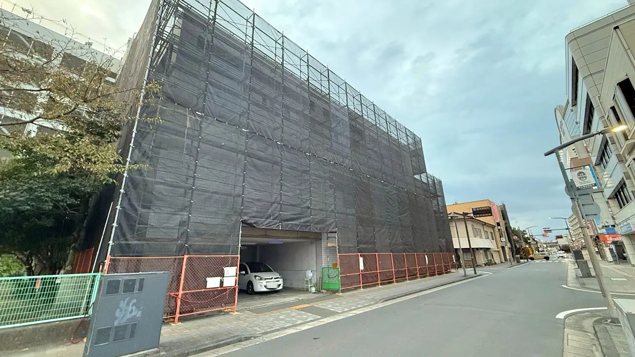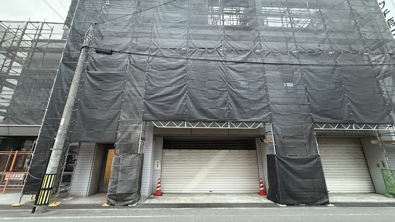 建物付近には足場が設置され、建物全体が黒い工事用シートで囲われていました。