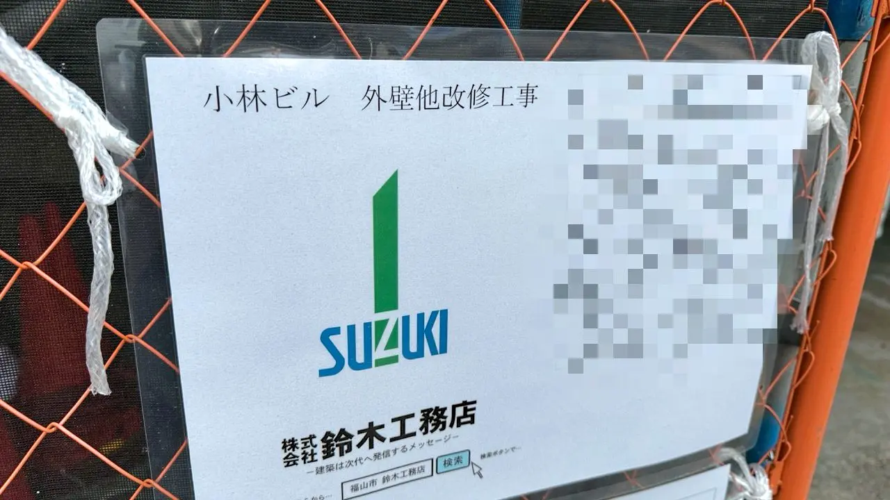 工事現場付近にあった張り紙によると、「小林ビル 外壁改修工事」と記載されていました。