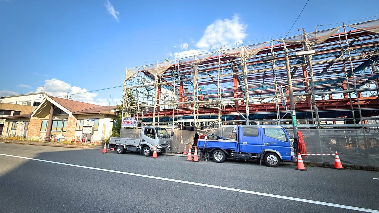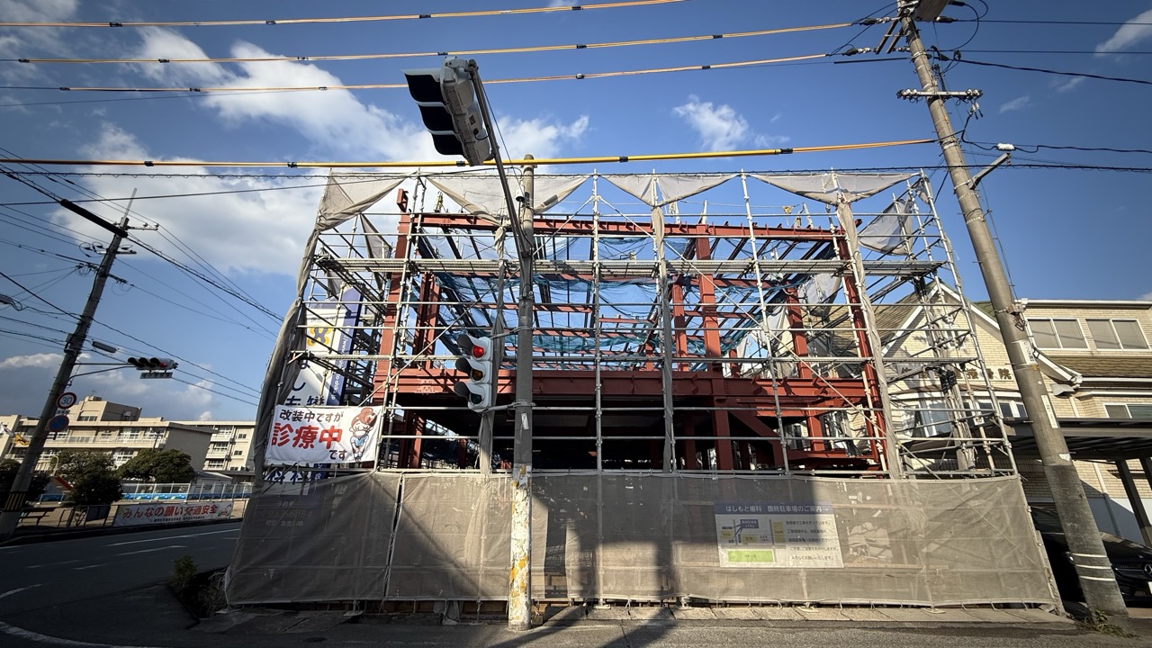 工事が行われている建物付近には足場が設置され、鉄骨が見える状態でした。