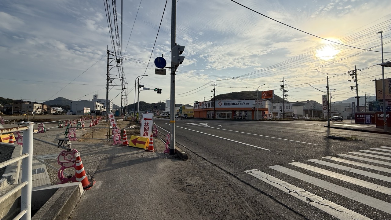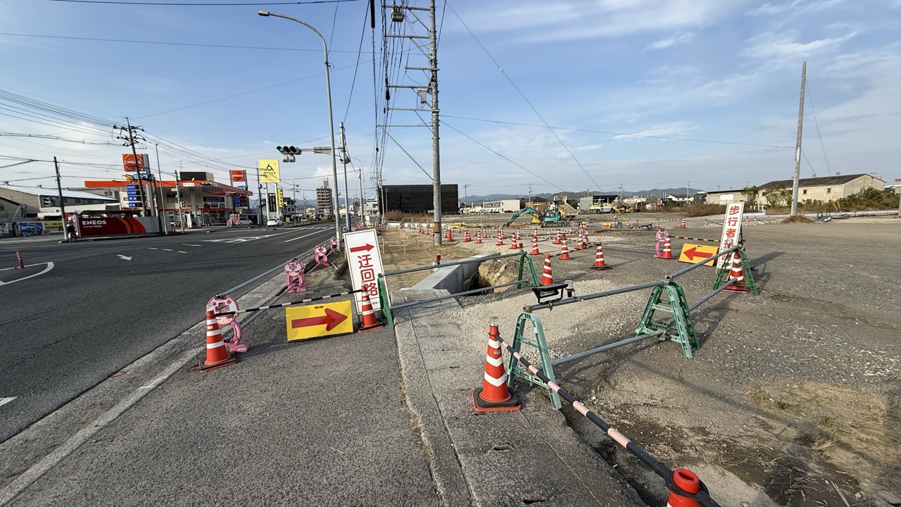工事現場付近にはバリケードが設置されており、重機の奥には新しい道路が見えました。
