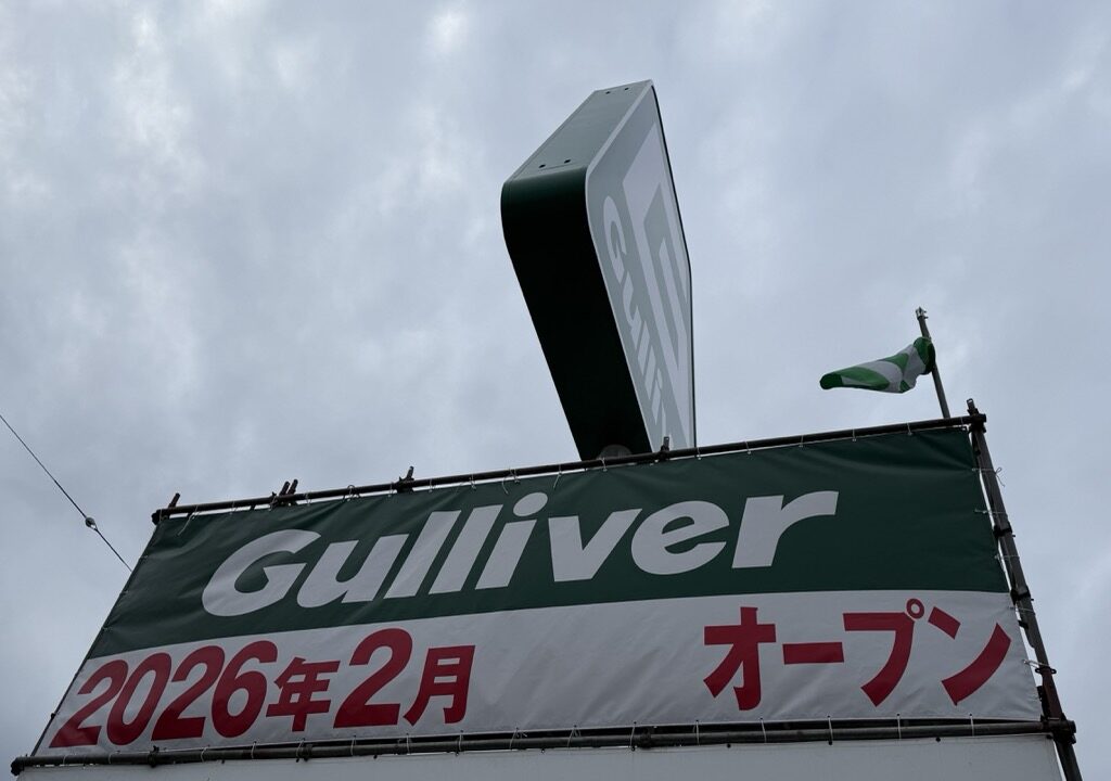 ガリバーと聞くと福山市蔵王町にある靴屋さんの「シューズランドガリバー 蔵王店」を連想する方も多いかもしれませんが、看板のロゴからして中古車の売買を行っている「Gulliver」のようですね。