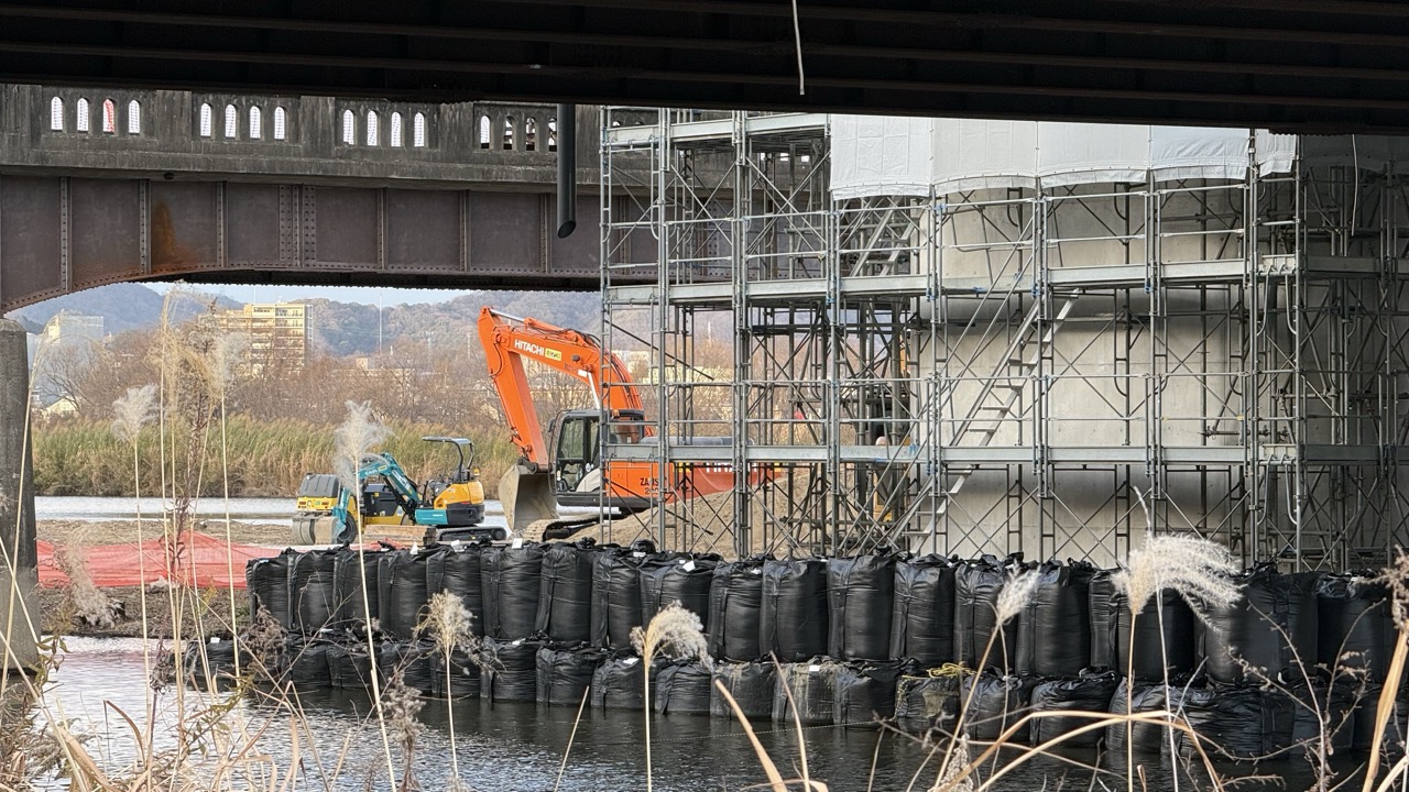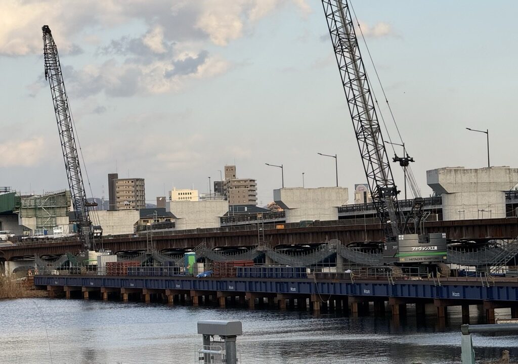 新しい草戸大橋と旧草戸大橋の間では、福山沼隈線の橋脚の工事も行われています。