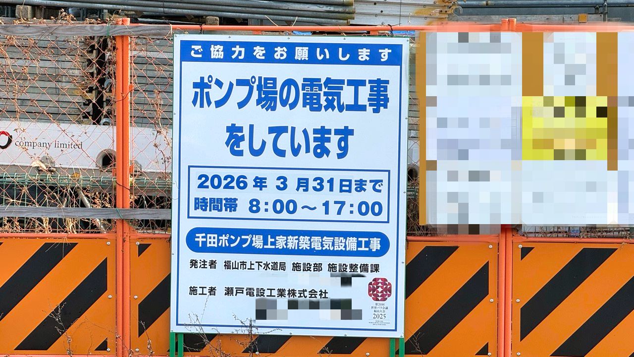 工事現場付近にあった看板によると、工事名は「千田ポンプ場 上家新築電気設備工事」です。