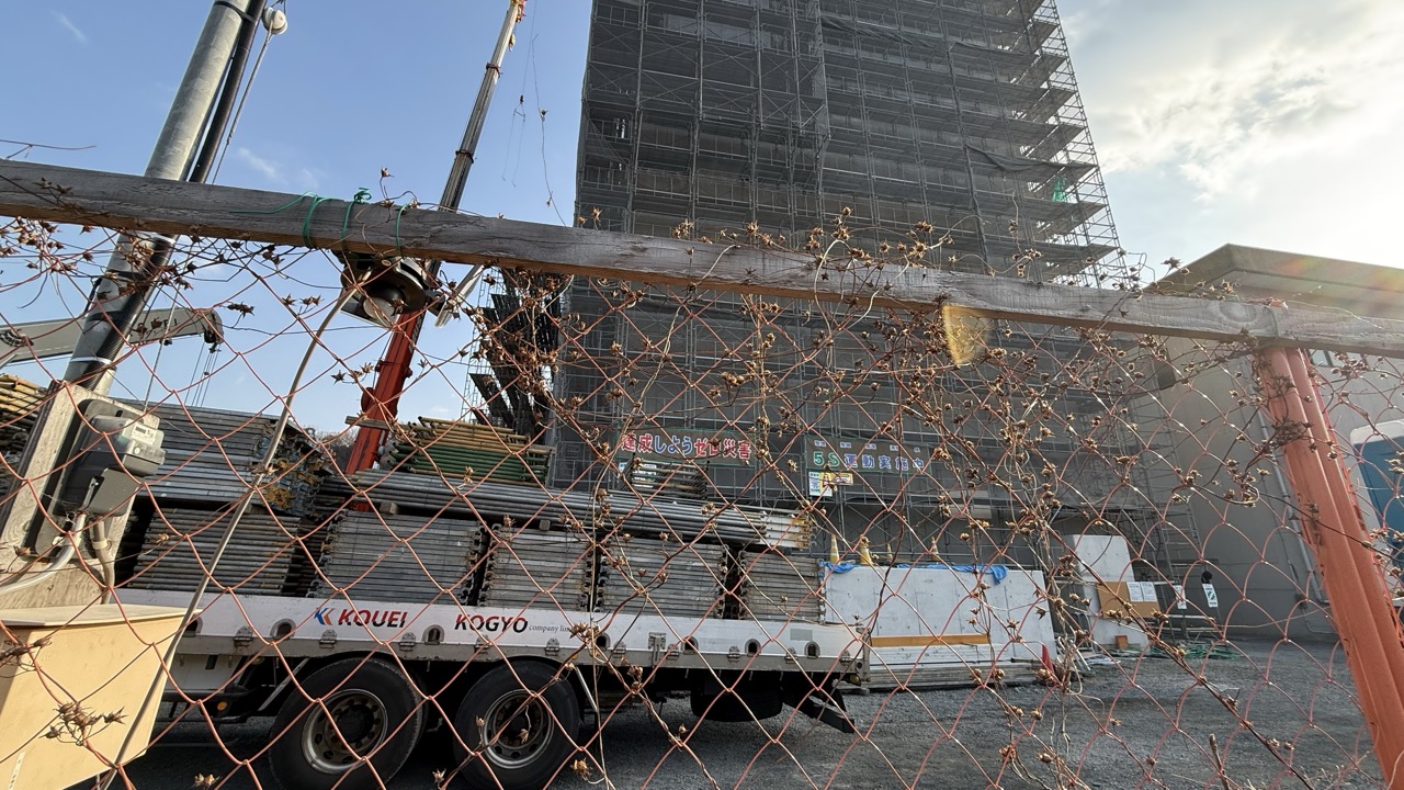 2026年1月17日の段階では、建物周辺に足場が組まれ新築工事が行われていました。