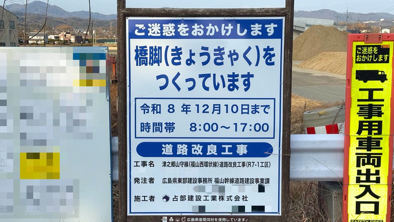 工事現場付近にあった看板によると、工事名は「津之郷山守線(福山西環状線)道路改良工事(R7-1工区)」で、工期は12月10日までです。