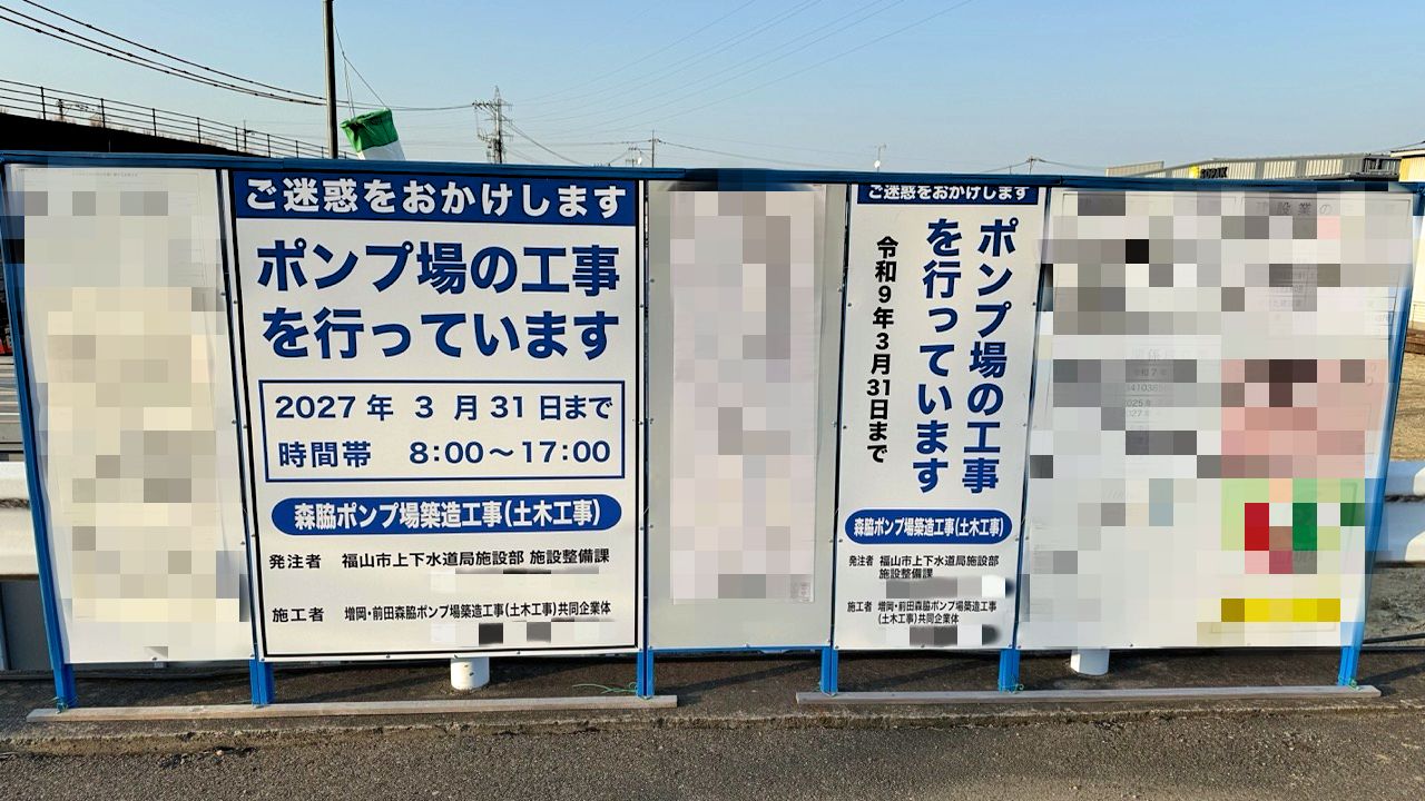 工事現場付近にあった看板によると、工事名は「森脇ポンプ場 築造工事(土木工事)」です。