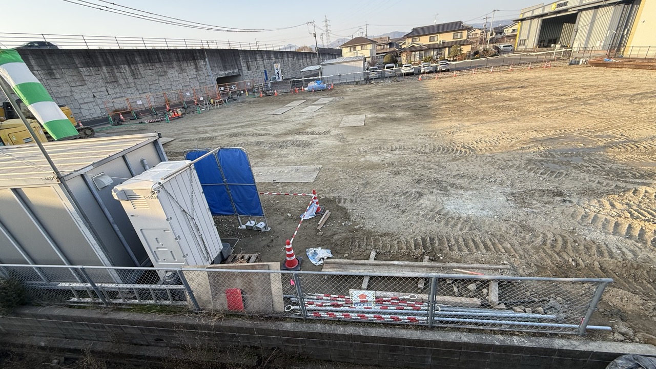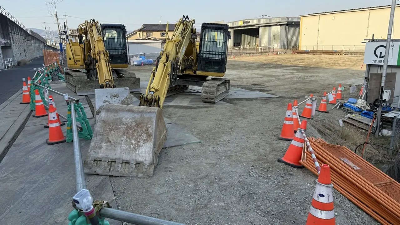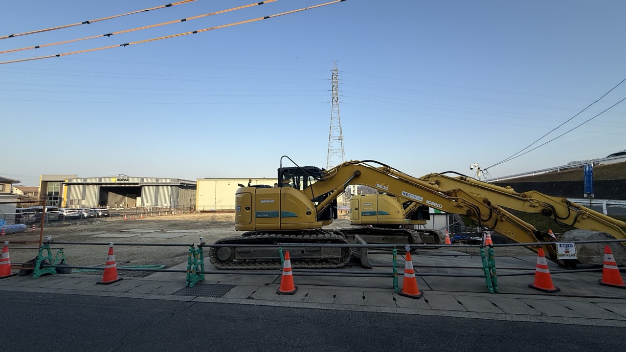工事現場には複数の重機がありましたが、敷地内はまだほとんど更地の状態でした。