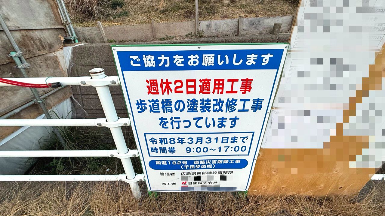 千田歩道橋では塗装改修工事が行われており、工事期間中は利用できません。