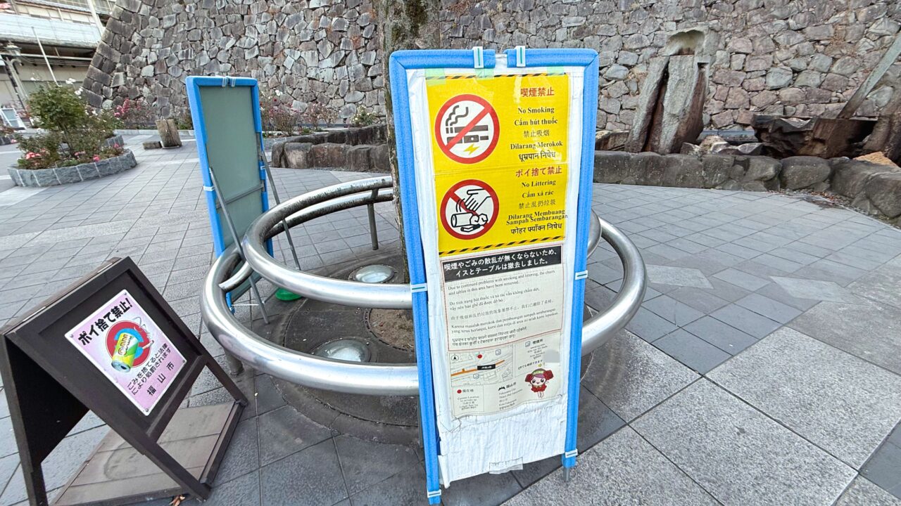 噴水付近に看板が設置されており、「喫煙やごみの散乱がなくならないため、イスとテーブルは撤去しました。」と記載されていました。