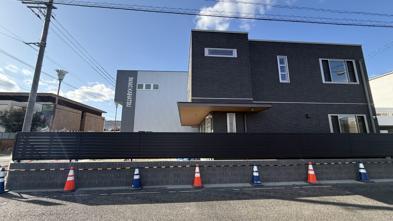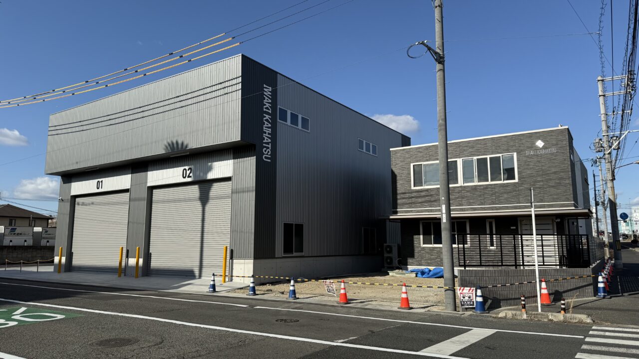 株式会社 岩木開発の整備工場と新事務所は、どちらも落ち着いた色合いの外壁で四角い建物なので統一感が感じられます。