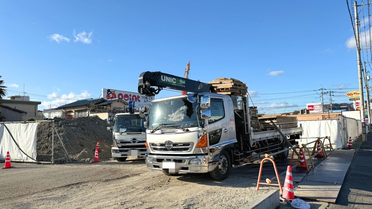 2026年1月31日の段階では工事現場付近に複数のトラックがあり、土砂が積み上げられていました。