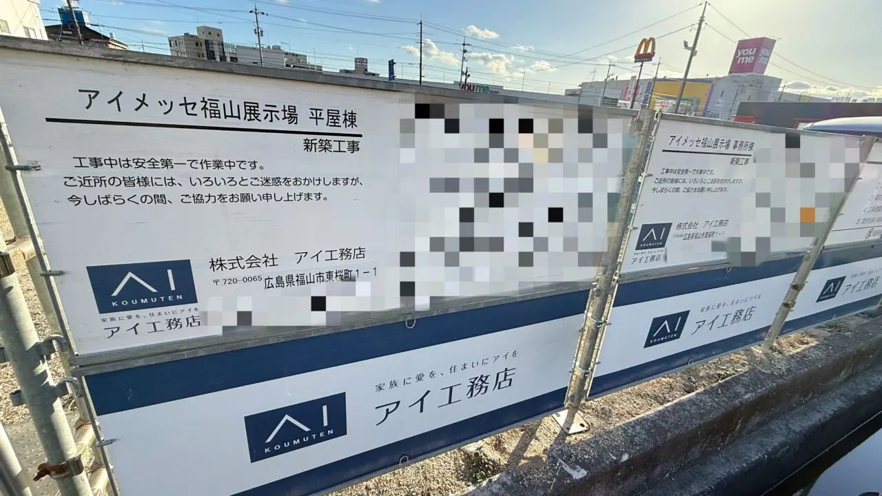 2026年1月31日の段階では、工事現場付近に設置されたフェンスに「アイメッセ福山展示場 平屋棟 新築工事」、「アイメッセ福山展示場 事務所棟 新築工事」と記載されていました。