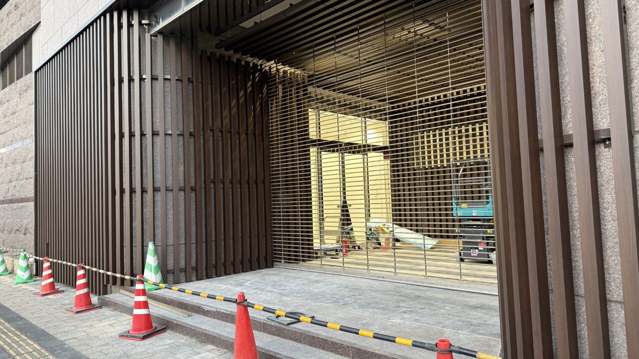 建物の入口付近には三角コーンが設置されていました。