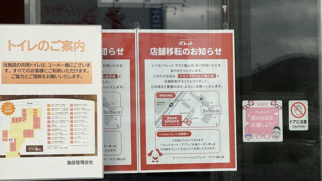 ドラッグセイムス サファ福山店跡地には、デイリーファッション「パレット サファ福山店」が移転する予定となっています。
