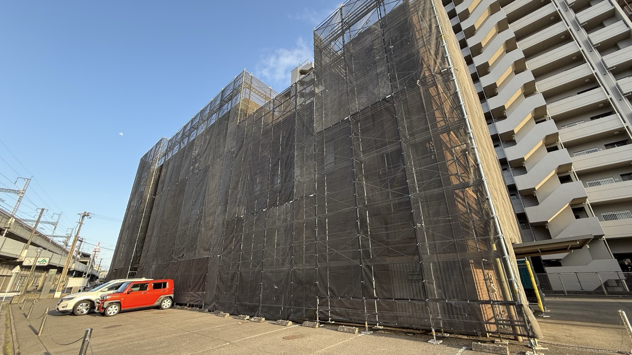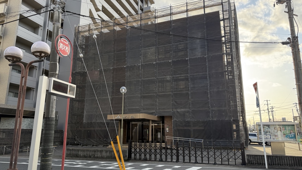 2026年2月28日に「JAビル 福山」の様子を見に行くと、建物付近に足場が設置されていました。