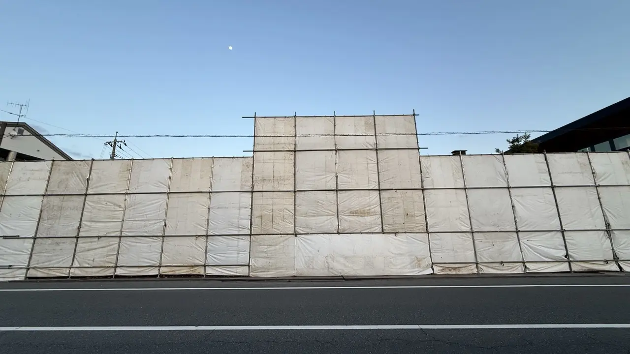2025年12月13日に様子を見に行った時には、建物全体が工事用シートで囲われていました。