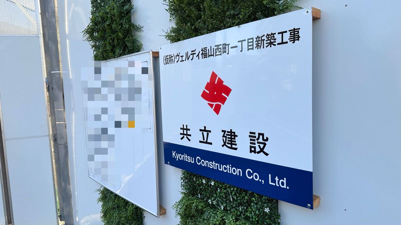 工事現場はフェンスで囲われ、「(仮称)ヴェルディ福山西町一丁目 新築工事」と記載された看板が設置されていました。