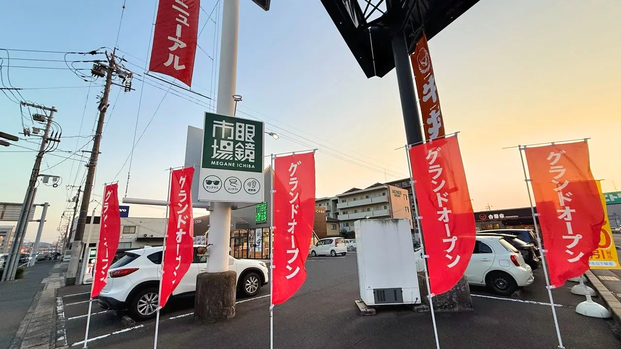 2026年3月21日に「眼鏡市場 福山店」の様子を見に行くと、「グランドオープン」と記載されたのぼりが設置されていました。