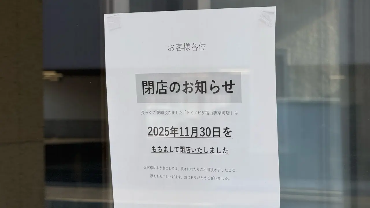 長らくご愛顧頂きました「ドミノピザ福山駅家町店」は2025年11月30日をもちまして閉店いたしました