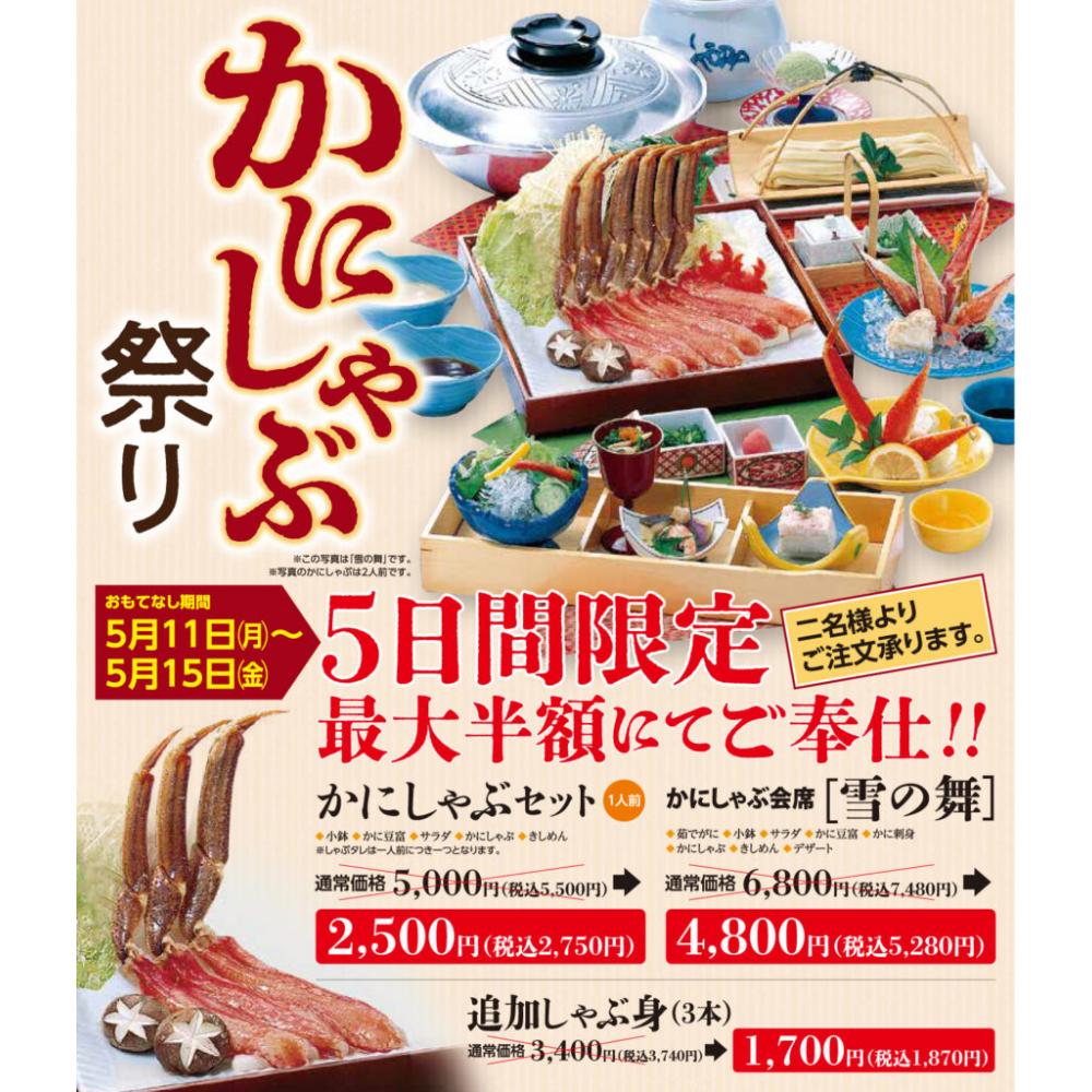福山甲羅本店では、5月11日(月)〜5月15日(金)まで「かにしゃぶ祭り」を開催いたします!