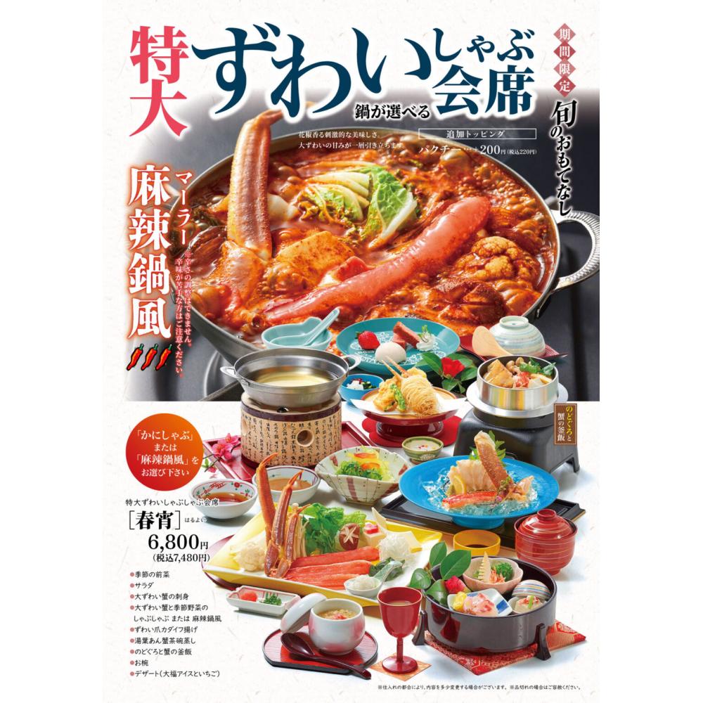 食べ応え抜群の豪快な特大ずわいを「かにしゃぶ」で味わうも良し、花椒香る刺激的な美味しさの「麻辣風鍋」で味わうも良し!