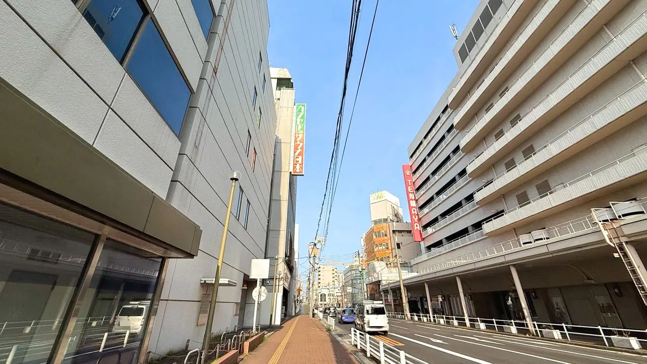 1階にはコワーキングスペース「halappa」があり、道路を挟んだ向かい側には「天満屋 福山店」があります。